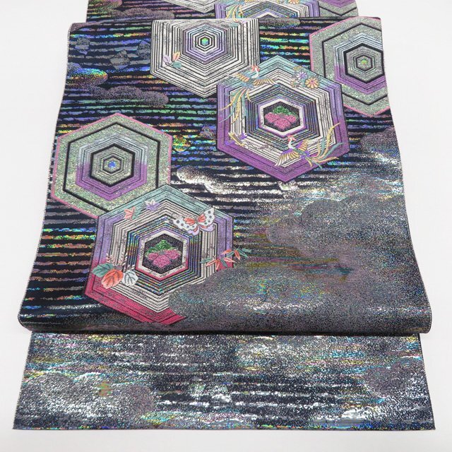 - 袋帯 未使用 正絹 フォーマル 仕立て上がり 六通 九百錦 亀甲優美文 鳳凰 蝶 オーロラ箔 濃紺色 多色 金銀 きもの北條 A1232-12