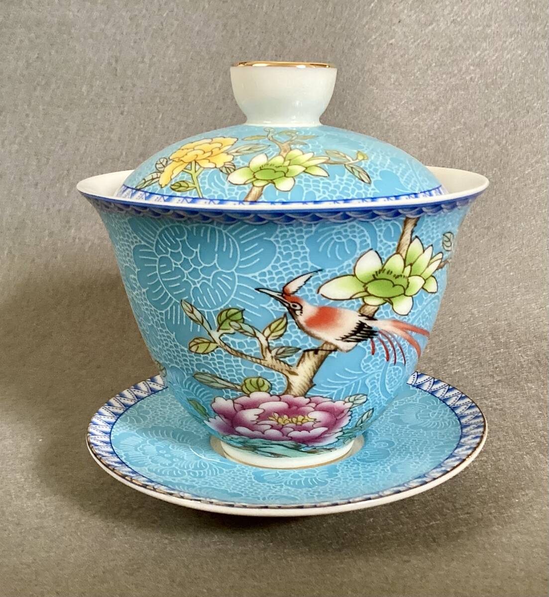 - 蓋碗「鳥語花香」天空色(中国茶器)磁器・琺瑯蓋碗