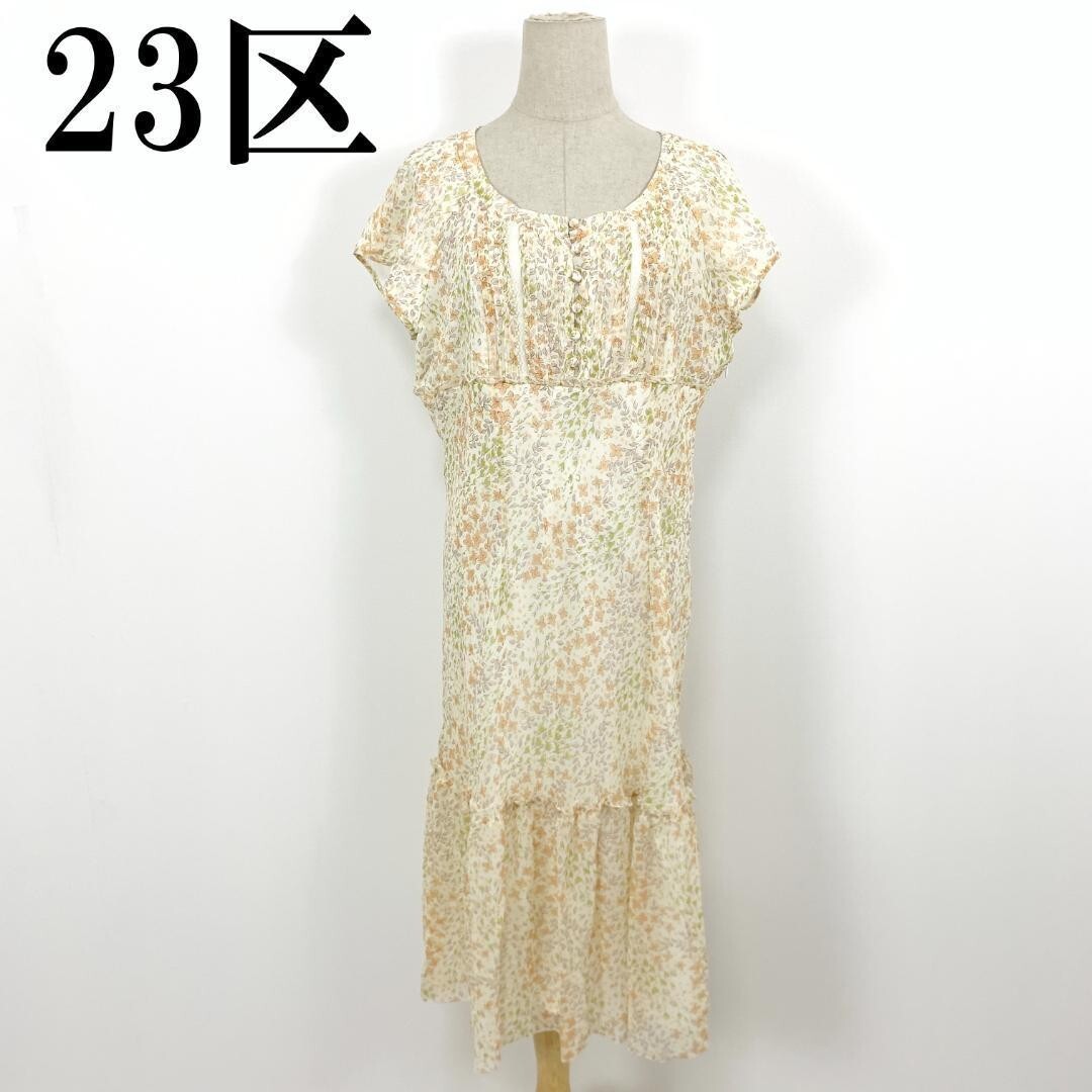 > LA6698 23区 花柄 半袖ロングワンピース ポリエステルフリル ドロップショルダー シフォンフレア ベージュ 46