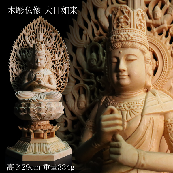 - ◇雅◇ 仏教美術 木彫彫刻 細密彫 大日如来像 高さ29cm/334g 仏像 座像 仏具 置物 箱付 /BOA.25.6 [K53.1] V