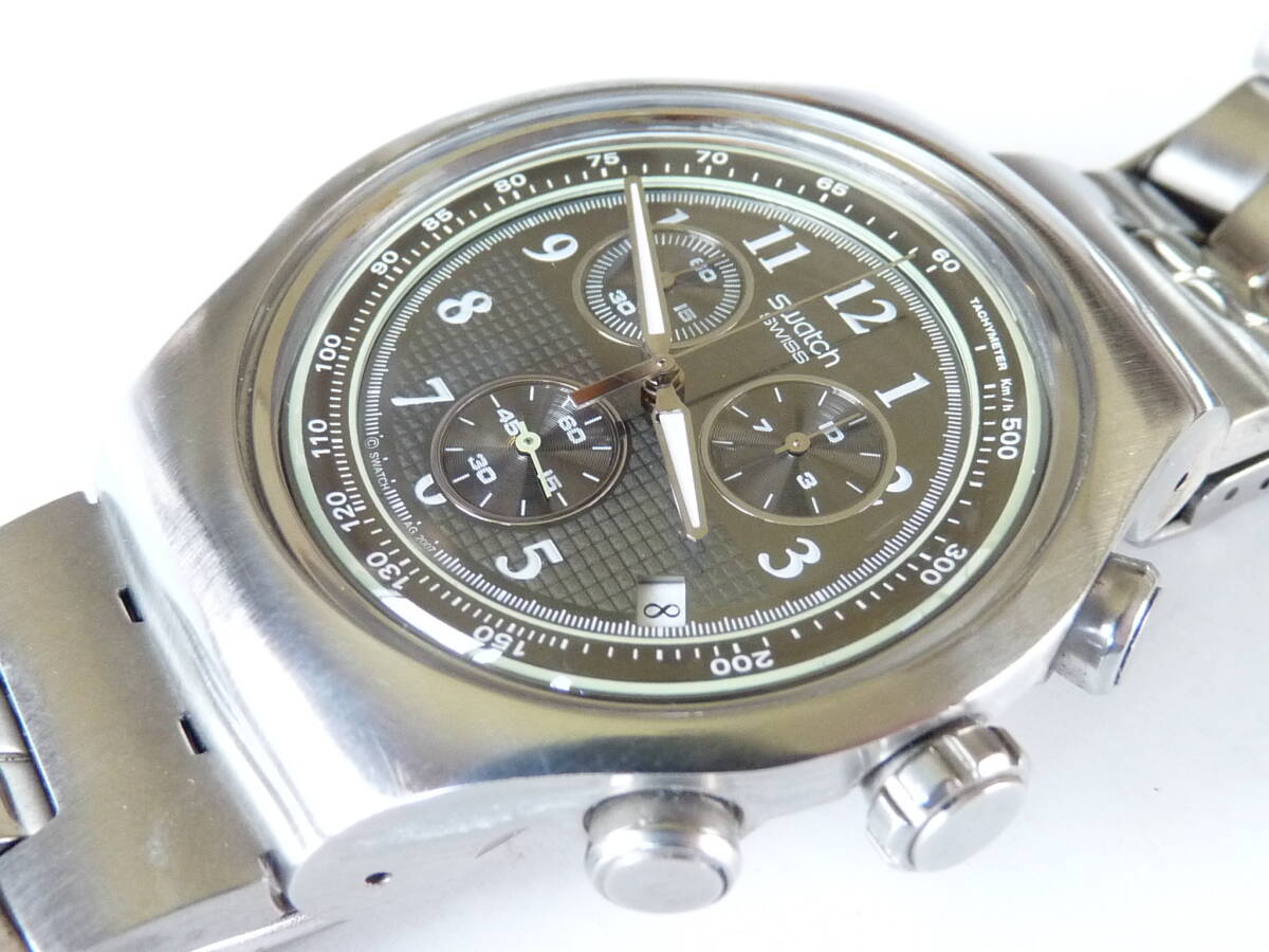 > 極短期使用 電池交換済 2008年モデル スウォッチ Swatch 特大アイロニークロノ MR GREY 品番YOS424 4時方向にデイト表示有り