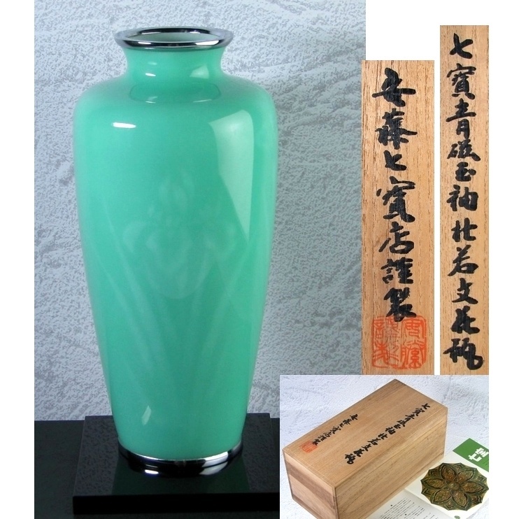 - 宮内庁御用達 安藤七宝店 七宝青磁玉釉杜若文花瓶 美品 共箱・紙箱/23f049