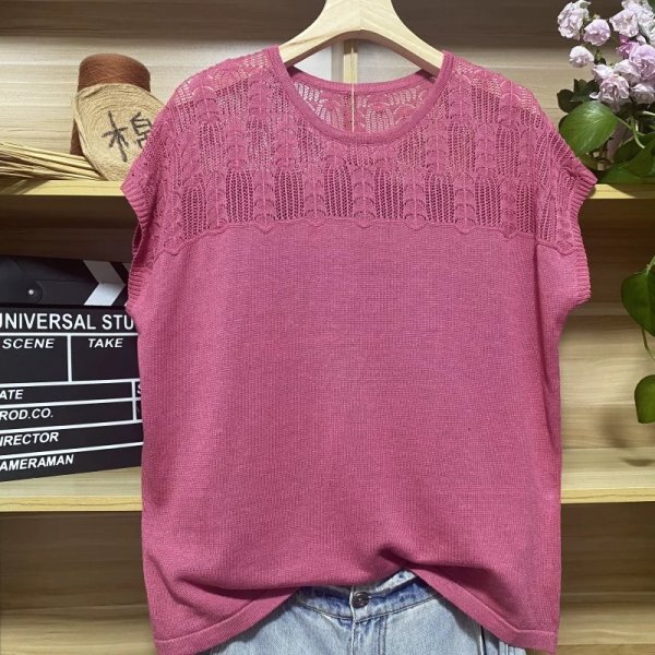 - 25zy サマーニット トップス 高質 ラフ 麻タッチニット チュニック ナチュラル 麻混 サラサラ 涼感 クールネック 織り込み柄2