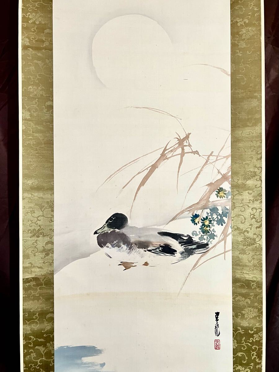 - 【真作】【S8】和田春龍「朧月夜鴨之図」絹本 肉筆 合箱 秋景 花鳥図 鳥獣 風月 菊花 絵画 掛軸 昭和時代の日本画家 円山派 師: 田中頼璋