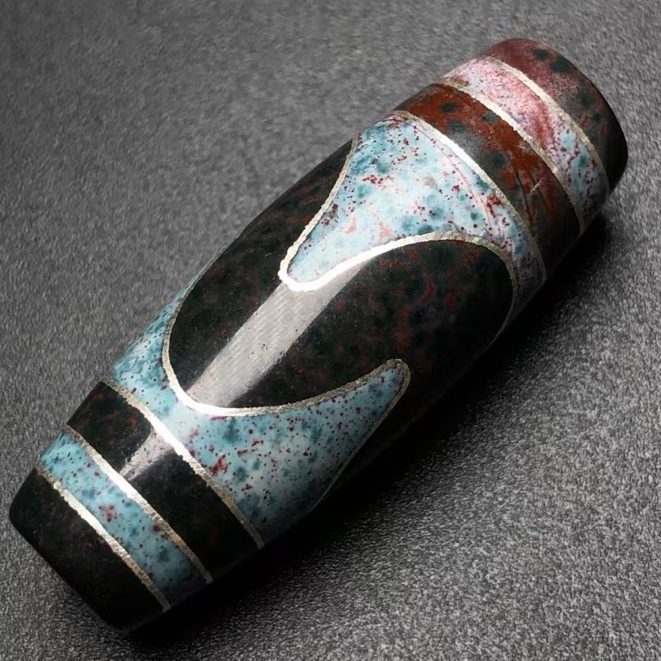- 秘藏 清代 チベットの老天珠 高油老料 銀糸をちりばめた朱砂【八重歯の天珠】包漿渾厚 裝身具 骨董品 風水 開運 辟邪 吊墜 挂件 玉佩7.13