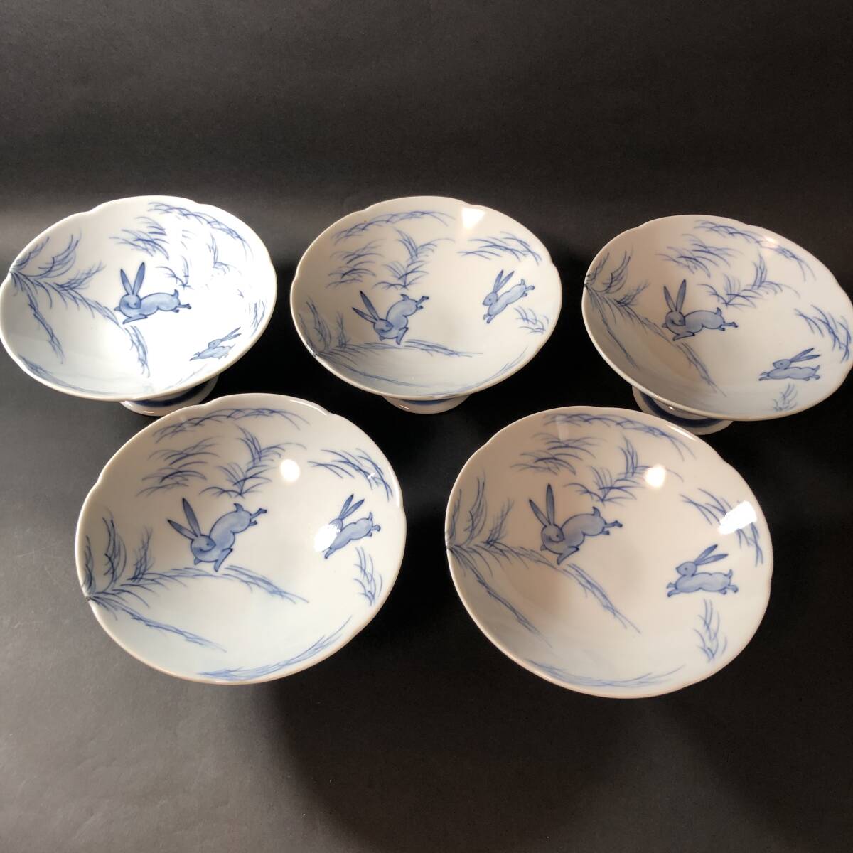 - 有田焼 平戸焼 脚付き盛皿 高杯皿 染付 草原に飛びうさぎ文様 五客 和食器 懐石料理 テーブルコーディネート