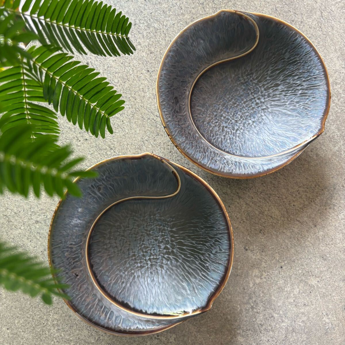 - 美濃焼 ピーコック 小皿 2点セット 小鉢 深皿 とんすい 取り皿 和食器 孔雀 黒 グレー 高級 ひねり 丸 手作り 作家