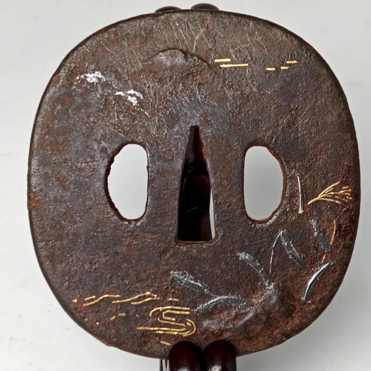 > 【A3733】金銀象嵌 鉄地 花草文彫刻 金銀象嵌色絵 刀鍔 つば ツバ 鐔 金工細密彫刻 刀装具 日本刀装具 刀剣美術 骨董品 アンティーク