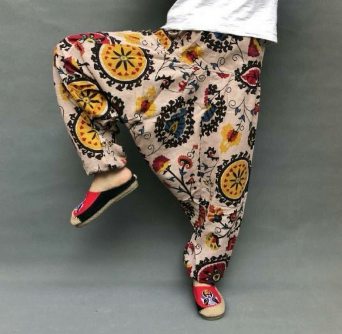 - 新品 サルエルパンツ アラジン カジュアルパンツ エスニック ボタニカル プリント メンズ ルームウェア ベージュ系 花柄 綿麻 リネン