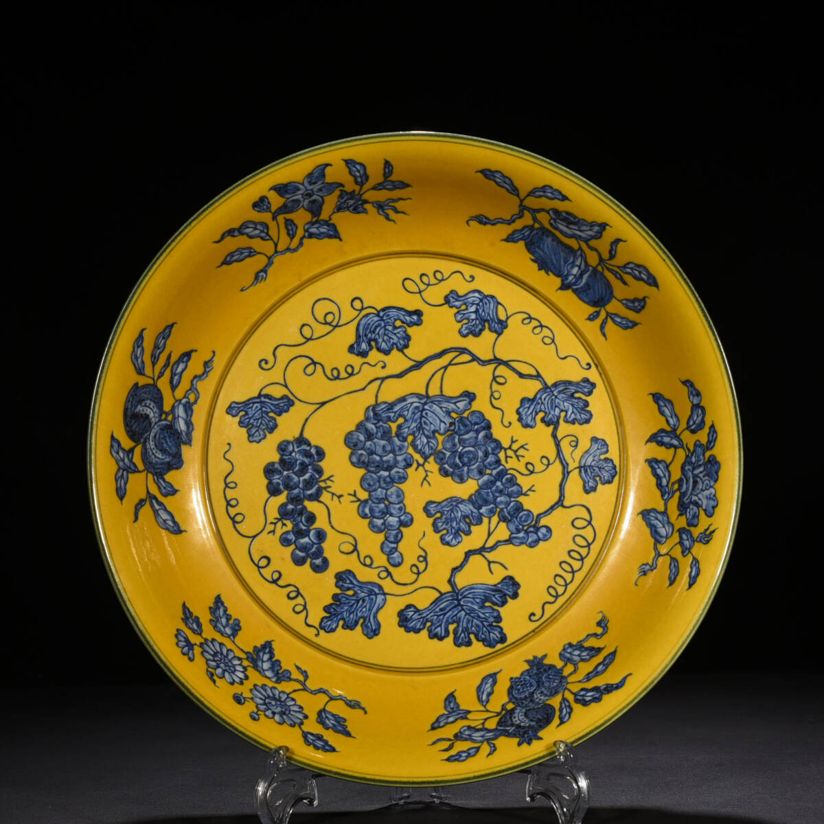 - ■XM116■明宣徳 嬌黄釉 青花葡萄紋盤 時代物 古玩 唐物 古陶磁器■