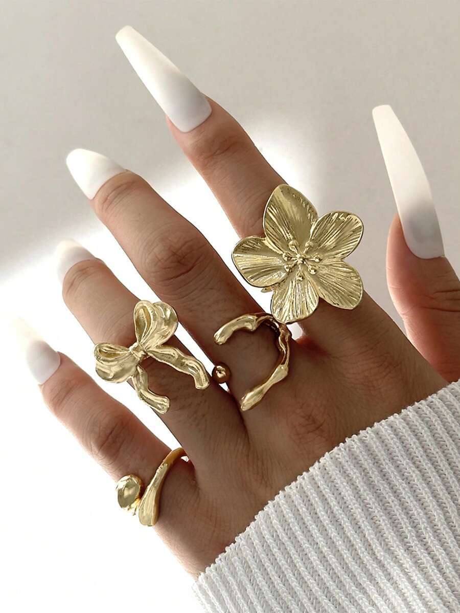 > リング レディース セット メタル オーバーサイズ フラワー合金リングセット 4個入り、非対称リボンデザイン、ヴィンテージフレンチ