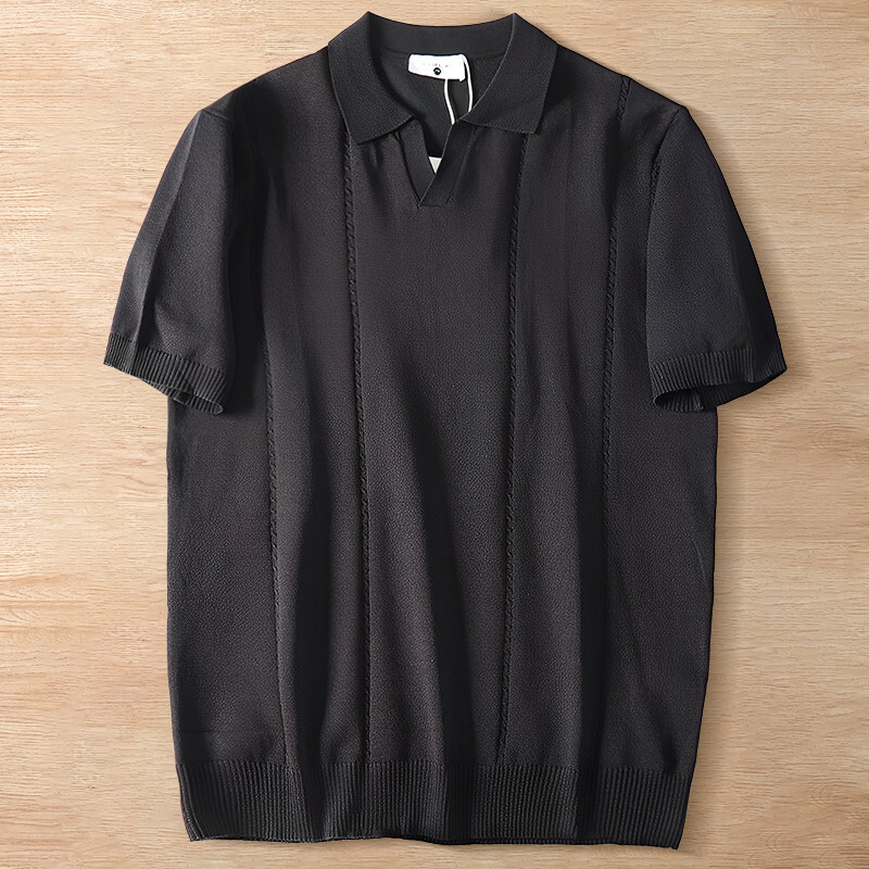 - T6912-L 新品 DCKMANY サマー ニット メンズ ゴルフ 半袖 ポロシャツ ケーブル編み テンセル混 スキッパー ストレッチ Tシャツ ブラック