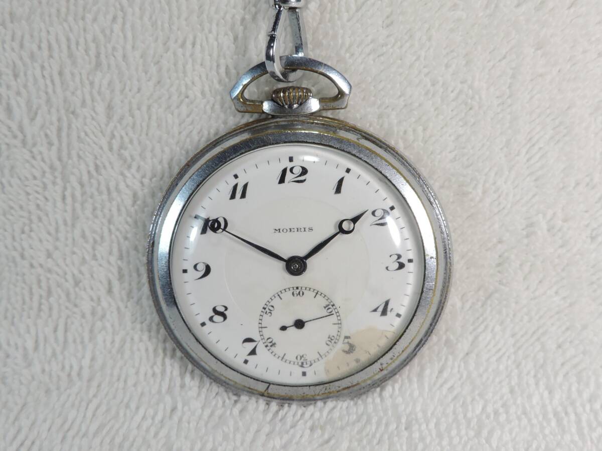 - 【質問欄より値下げ交渉可】MOERIS 手巻き懐中時計 シルバー系・稼働中・直径: 約 45ミリぐらい!