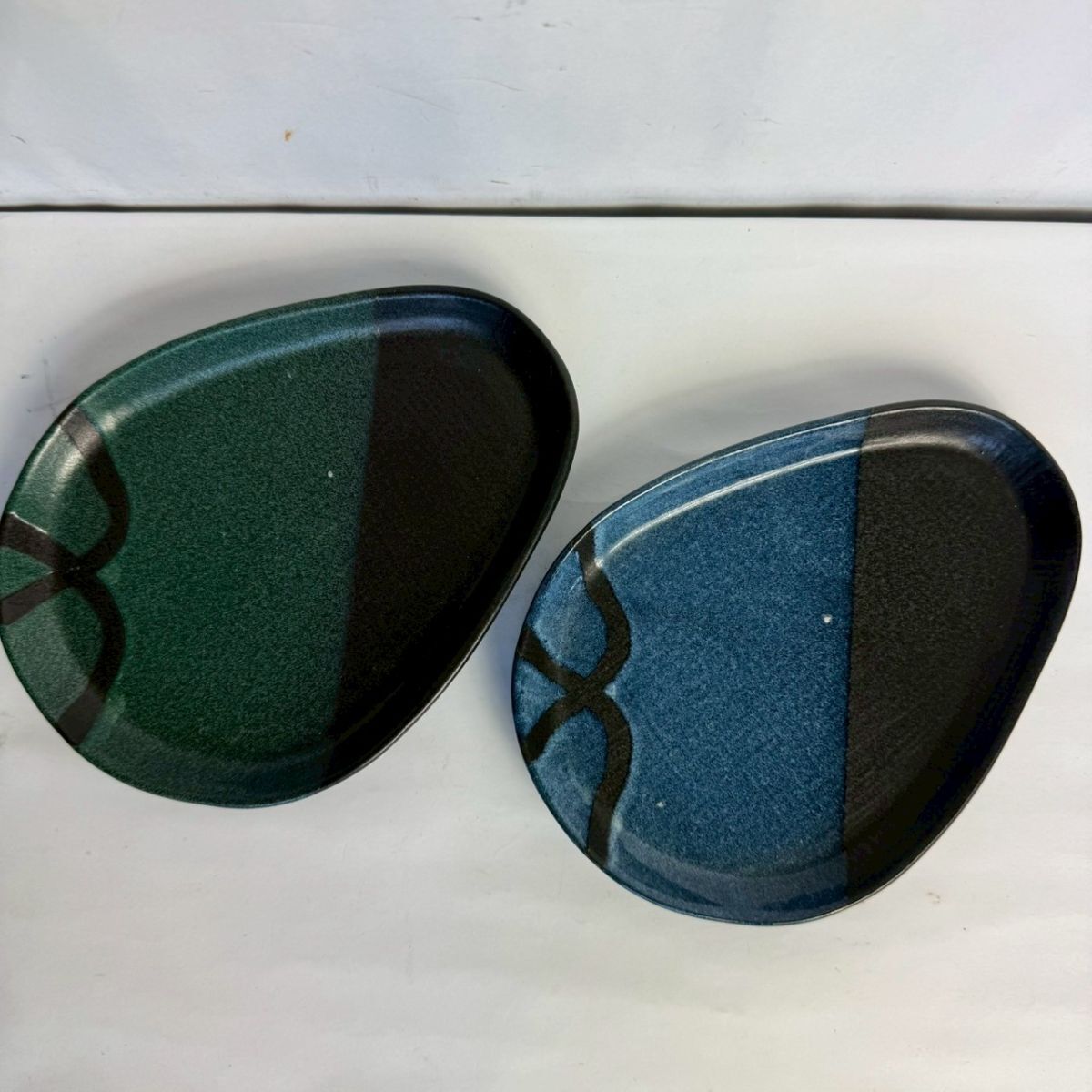 > 平皿 2個セット 2枚セット 中皿 和食器 陶器 プレート レトロ 青 緑 長期保管品 Z陶7 R7717