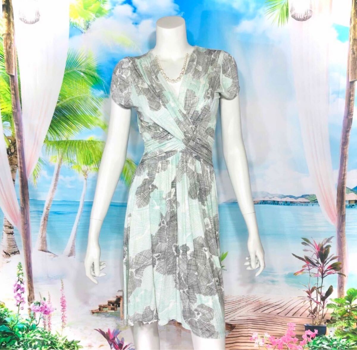 - EGERIE Paris ペールグリーン×グレーフラワーワンピース S T1