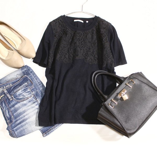 > 美品 DoCLASSE ドゥクラッセ 大人可愛い レース切り替え コットン ニット プルオーバー L 春 夏 25C07