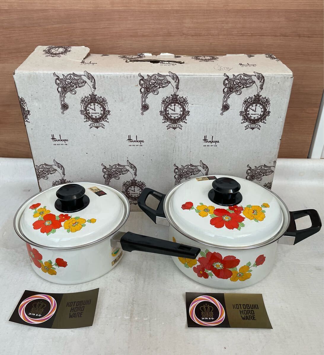 > 昭和レトロ 未使用 阪急百貨店 KOTOBUKI HORO WARE コトブキ ホーローウエア 両手鍋 20cm2.8L 片手鍋18cm2.0L 2個セット 当時物 レトロ鍋
