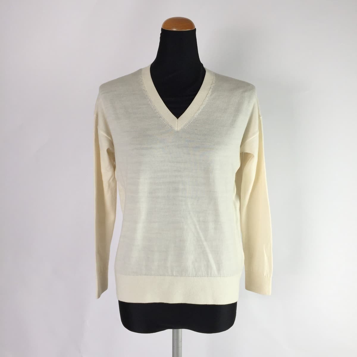 コメント:シンプルで合わせやすいニット。鎖骨を美しく華奢に見せてくれる、Vネックのラインです。通勤着はもちろんデイリーにも活躍するアイテムです。