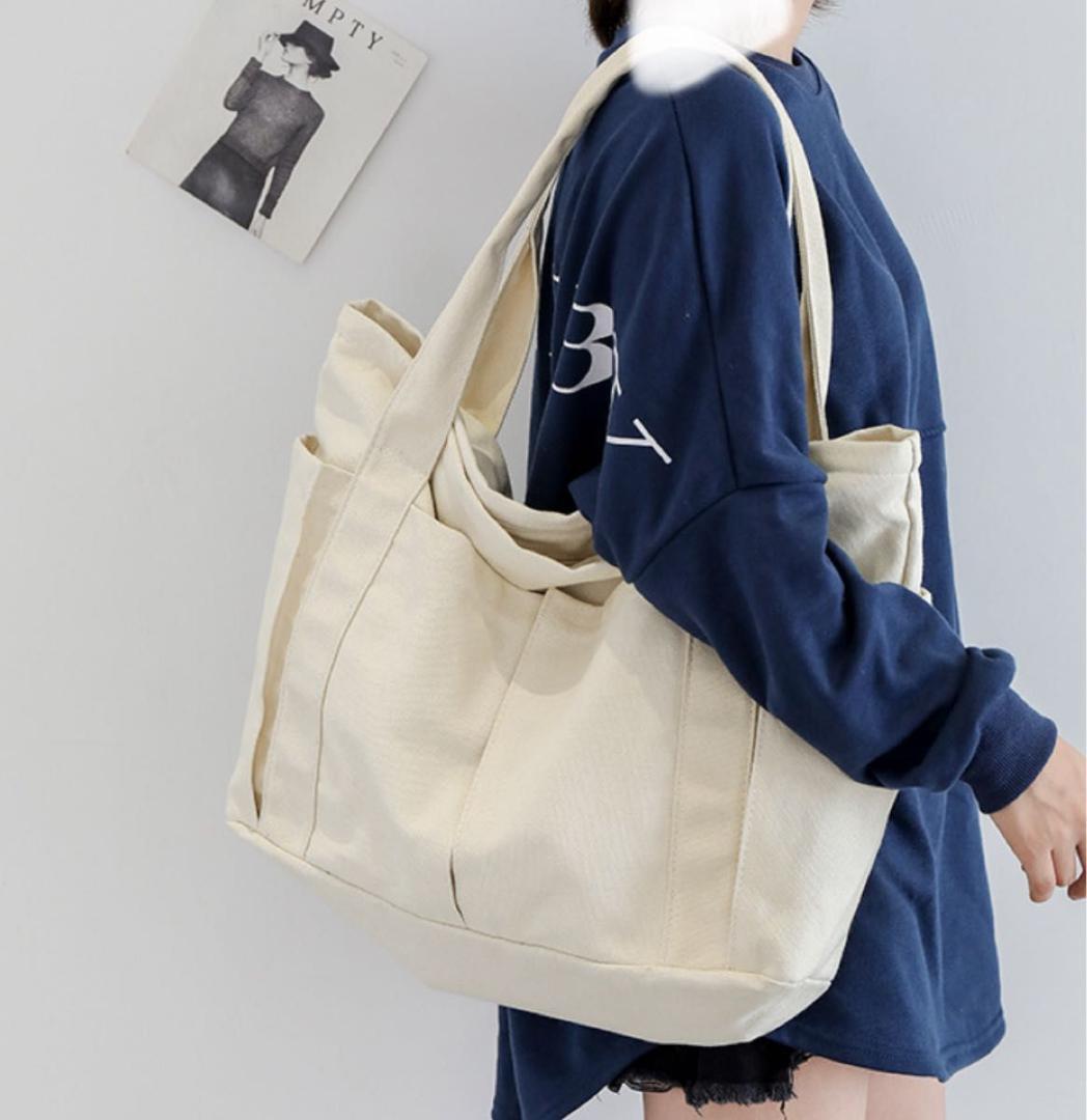 - 韓国風 トートバッグ 帆布 大容量 シンプル キャンバスバッグ 通勤 通学 アイボリー マザーズバッグ 大きなトートバッグ