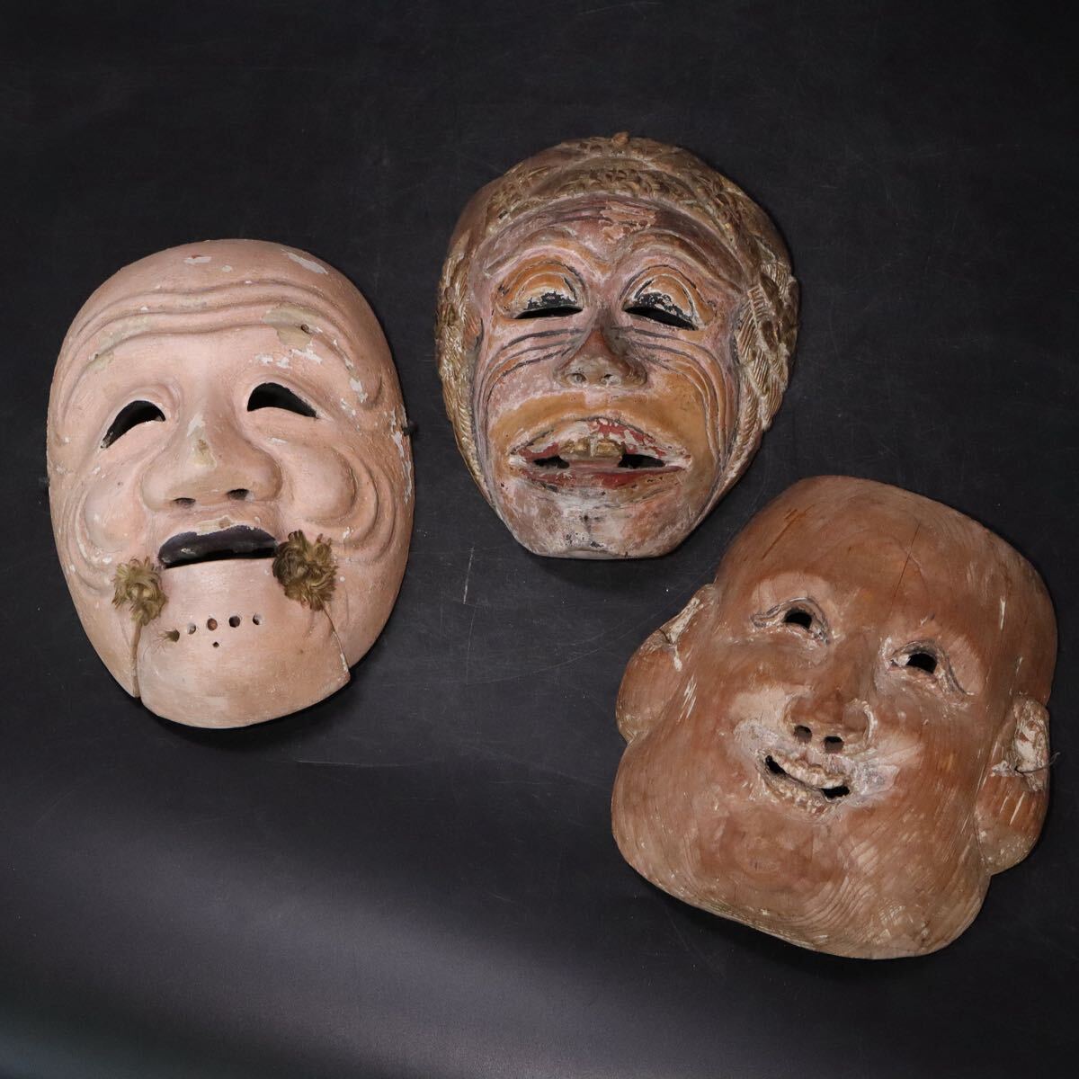 > 時代 木彫 猿面 ・ 大黒 (恵比寿)天 ・ 翁面 計3点 天然木 彩色 /検索: 能面 神楽面 舞楽 伎楽 民藝 李朝 中国 .B728