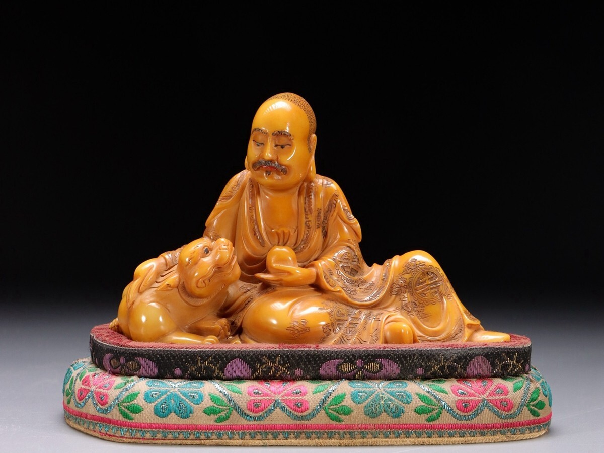- 「清時代 老寿山石 田黄石彫り 伏虎羅漢 造像」極細工 擺件 古賞物 中国古美術 旧蔵出