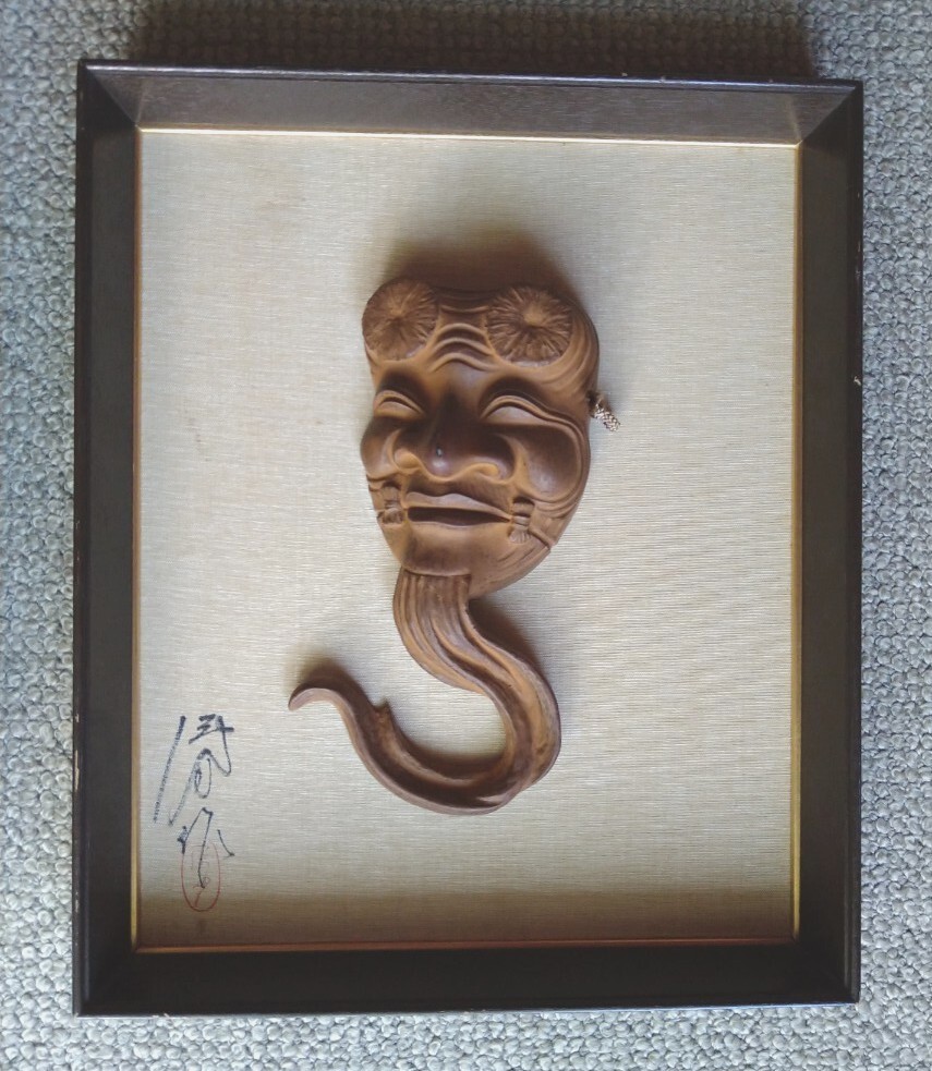 - 【貴重 格安出品】木彫レリーフ 翁面 額入り 署名落款有り サイズ縦約41 横約34 厚さ約4.5cm 能面 白式尉 肉色尉