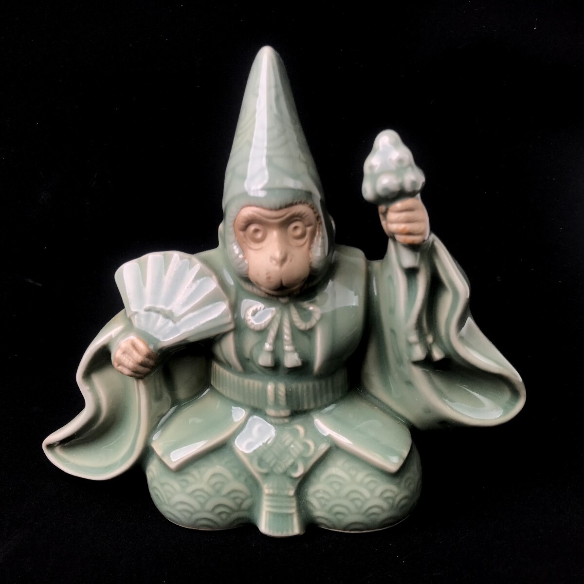 - 猴子陶瓷件 猿猴陶器 装品 青瓷釉猿猴 扇子桃子吉祥物 釉陶瓷 猿猴像 生肖猴 十二生肖和吉祥物