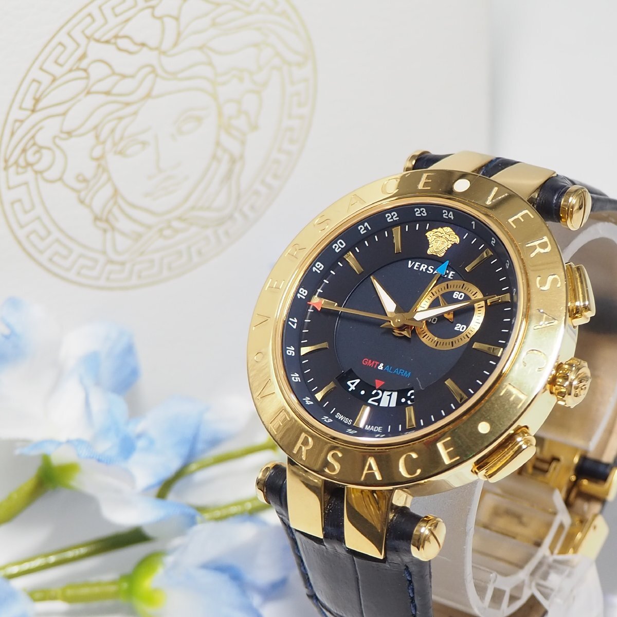 - 美品 ヴェルサーチ VERSACE GMT デイト メデューサ メンズ 腕時計 箱 F991 ゴールド 中古