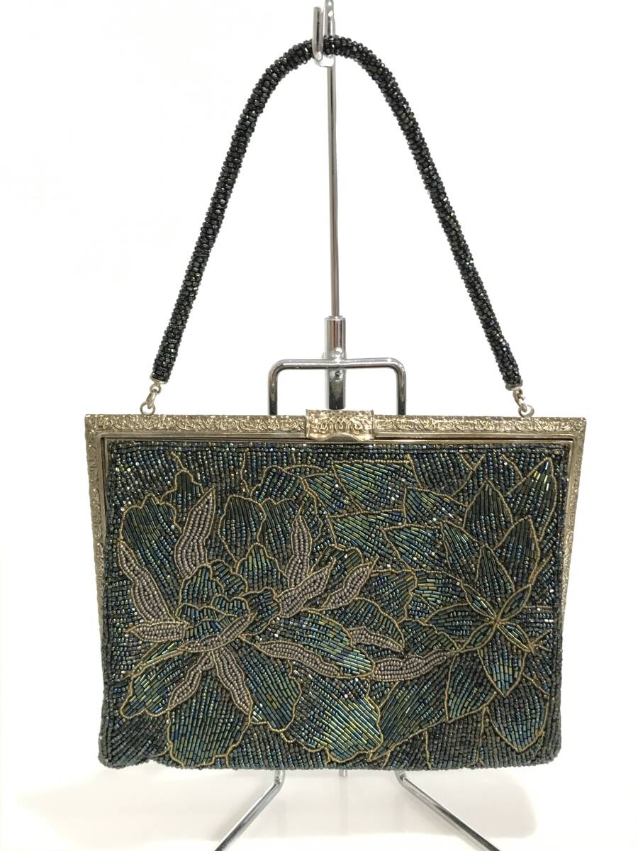 - DG8418 ビーズバッグ 和装バッグ 和装小物 花柄 グリーン×ブラウン系 がま口 クラッチバッグ