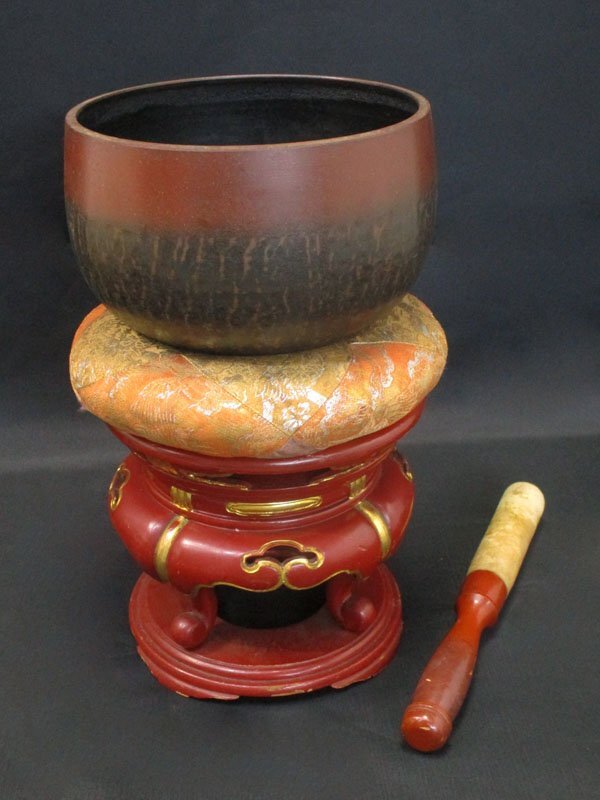 - 5406 【仏具】 お鈴 鈴台 鈴布団 鈴棒 セットで/おりん 直径約25cm 銅器 木製朱塗面金 丸金台 馨子台 寺院佛具 仏壇 法具 特大