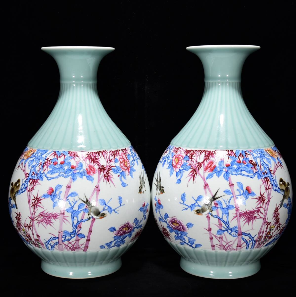 - ■LH212■大清雍正年制銘 豆青釉粉彩花鳥紋玉壺春瓶一対 時代物 古玩 唐物 古陶磁器■