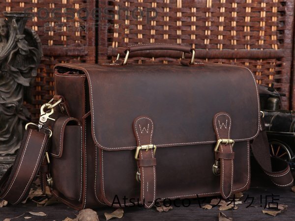 - アンティーク 厚手牛革 カメラバッグ 一眼レフ対応 本革 ショルダーバッグ A4鞄 2WAY ダークブラウン