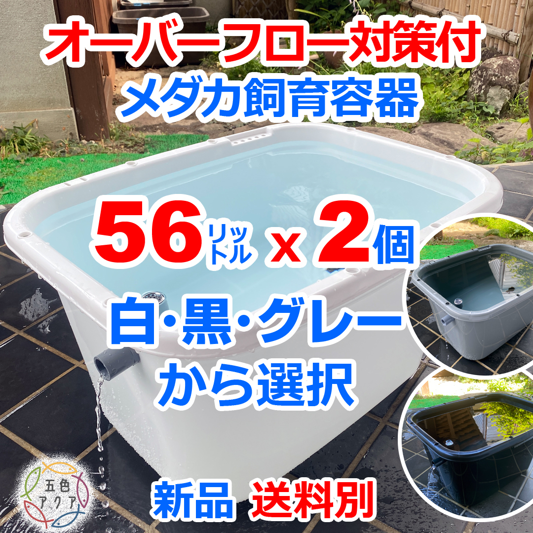 - 【新仕様】メダカ飼育容器 56㍑ 白黒灰選択可 2個 オーバーフロー対策付 送料別 新品 金魚飼育ケース ビオトープ 豪雨対策 【五色アクア