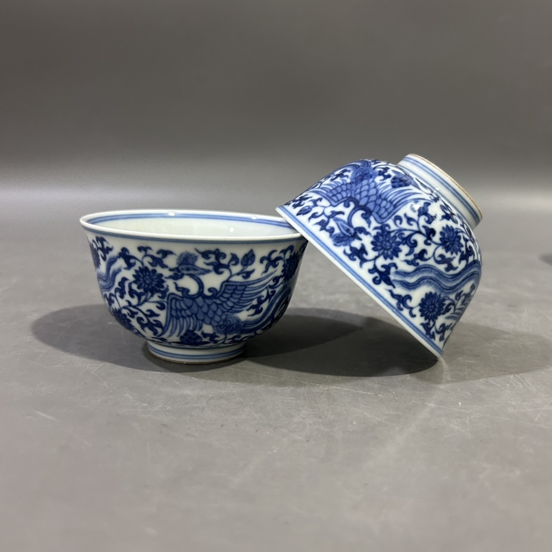 - ■BC144■大清康熙年清款 青花纏枝蓮鳳凰杯2客 時代物 古玩 唐物 古陶磁器■