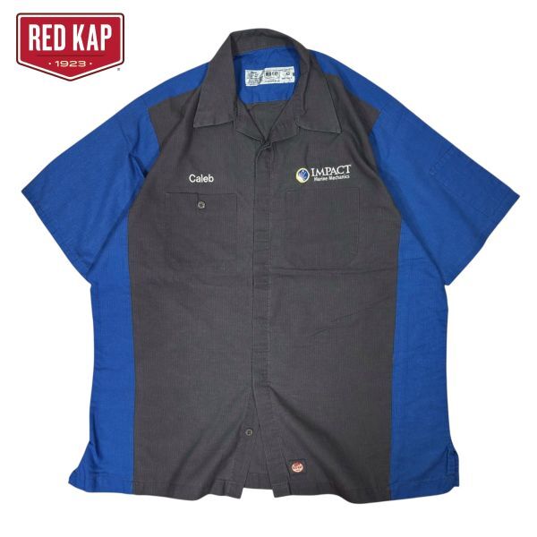 - ★IMPACTロゴ刺繍★RED KAP半袖オープンワークシャツsizeL 比翼ボタン ピスネーム スリット ペンホルダー 古着 洗濯 プレス済み 2396