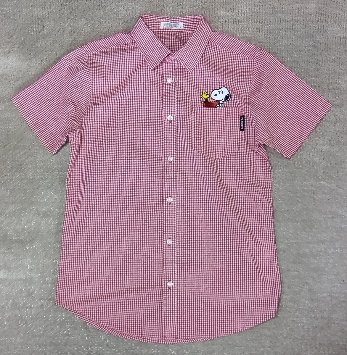> ◎ほぼ未使用◎超かわいい◎男女兼用◎PEANUTS ギンガムチェックスヌーピー刺繍半袖シャツ Size S レッド系