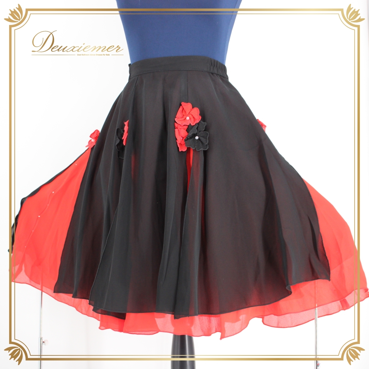 > 『送料無料』【美品 日本製社交ダンス衣装】ブラック系 黒 レッド系 赤 スカート レッスン パーティー ラインストーン スリット 派手