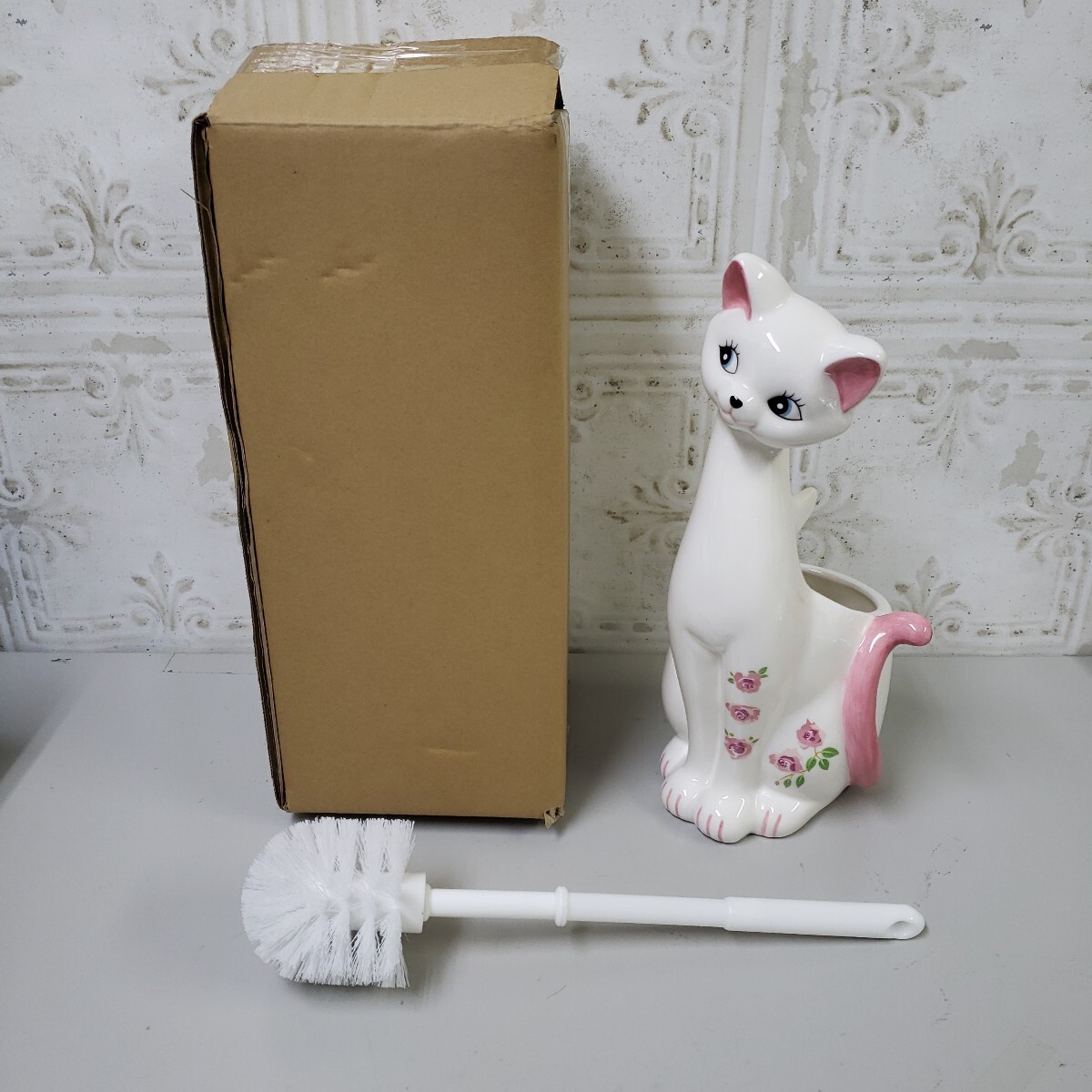 > 707y2810★サンアートかわいい雑貨 「 ラブリー陶器 」 ねこのトイレブラシ立て トイレブラシ付 幅13cm ピンク SAN1708