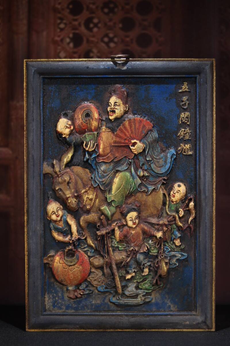 - 蔵友旧蔵出 木胎漆器彫 五子鬧鐘馗紋 掛牌 供養品 置物擺件 古賞物 中国古玩 中国古美術品
