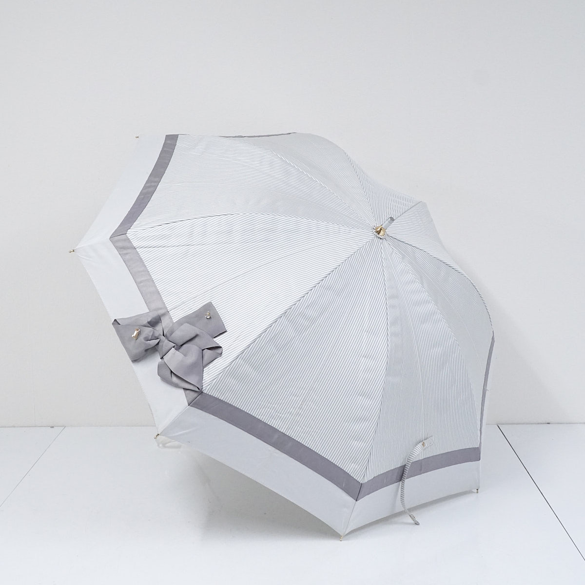 > 晴雨兼用日傘 LANVIN en Bleu ランバンオンブルー USED品 ビジューリボン ライトグレー ストライプ UV 遮光 グラス骨 50cm A2999