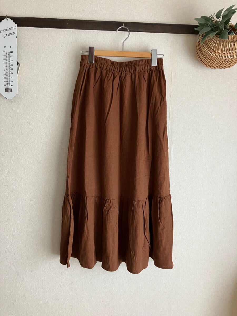 - 麻レーヨン ティアードスカート ロング Mサイズ 裏地付き ブラウン 匿名発送 送料込 秋色