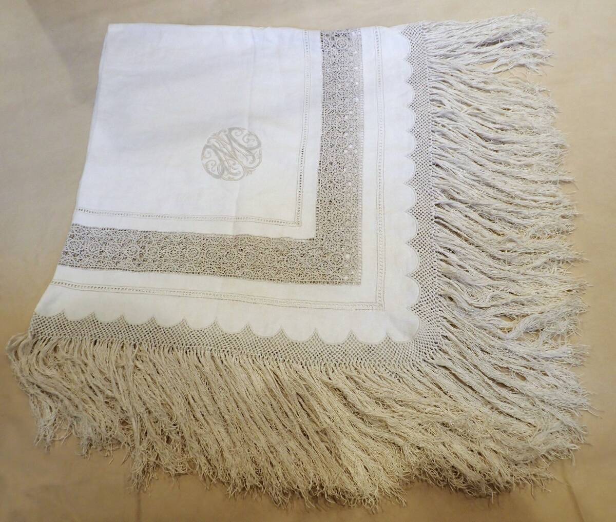 - イギリス フリンジ テーブルクロス マルチカバー モノグラム 刺繍 レース モノグラム フリンジ ヴィンテージ 英国 モノグラム刺繍