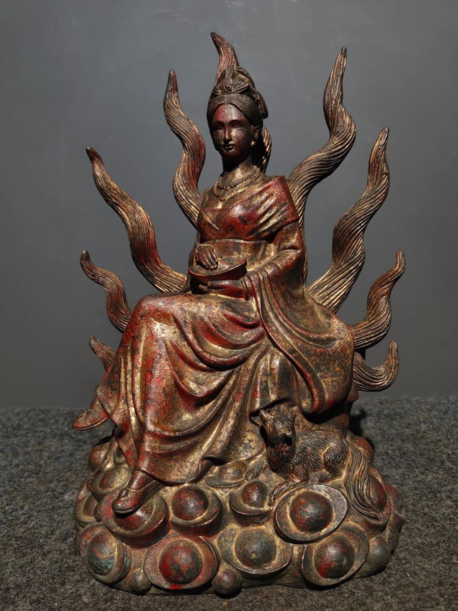 - 蔵友旧蔵出 銅製 泥金 撒朱砂 九尾財寶觀音菩薩像 希少珍品 貴重品 置物 古賞物 密宗密教 供養品 仏教美術品