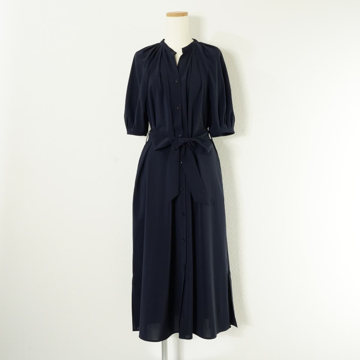 商品名:IENA イエナ バンドカラー シャツ ワンピース リボン 半袖 五分袖 ロング ギャザー 紺