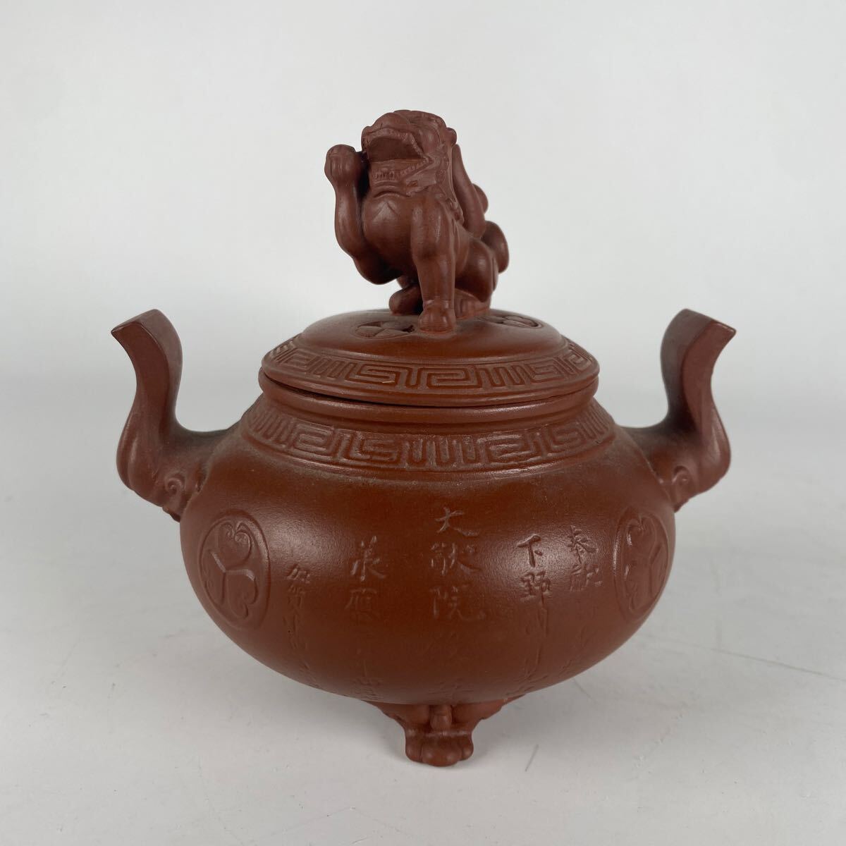 > 旧家整理品 日光山 輪王寺 朱泥 三つ葉葵紋獅子摘耳付三足香炉 香櫨 香道具 時代 茶道具 在銘 骨董品 高さ10.5cm 横11.5cm【730】