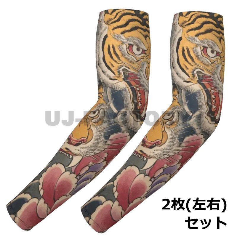 - 【タトゥーアームカバー】★ 和柄 虎 2枚セット 和風 紫外線をブロック 厚手ニットタイプ 腕 フルカバー UV対策 男女兼用 タイガー