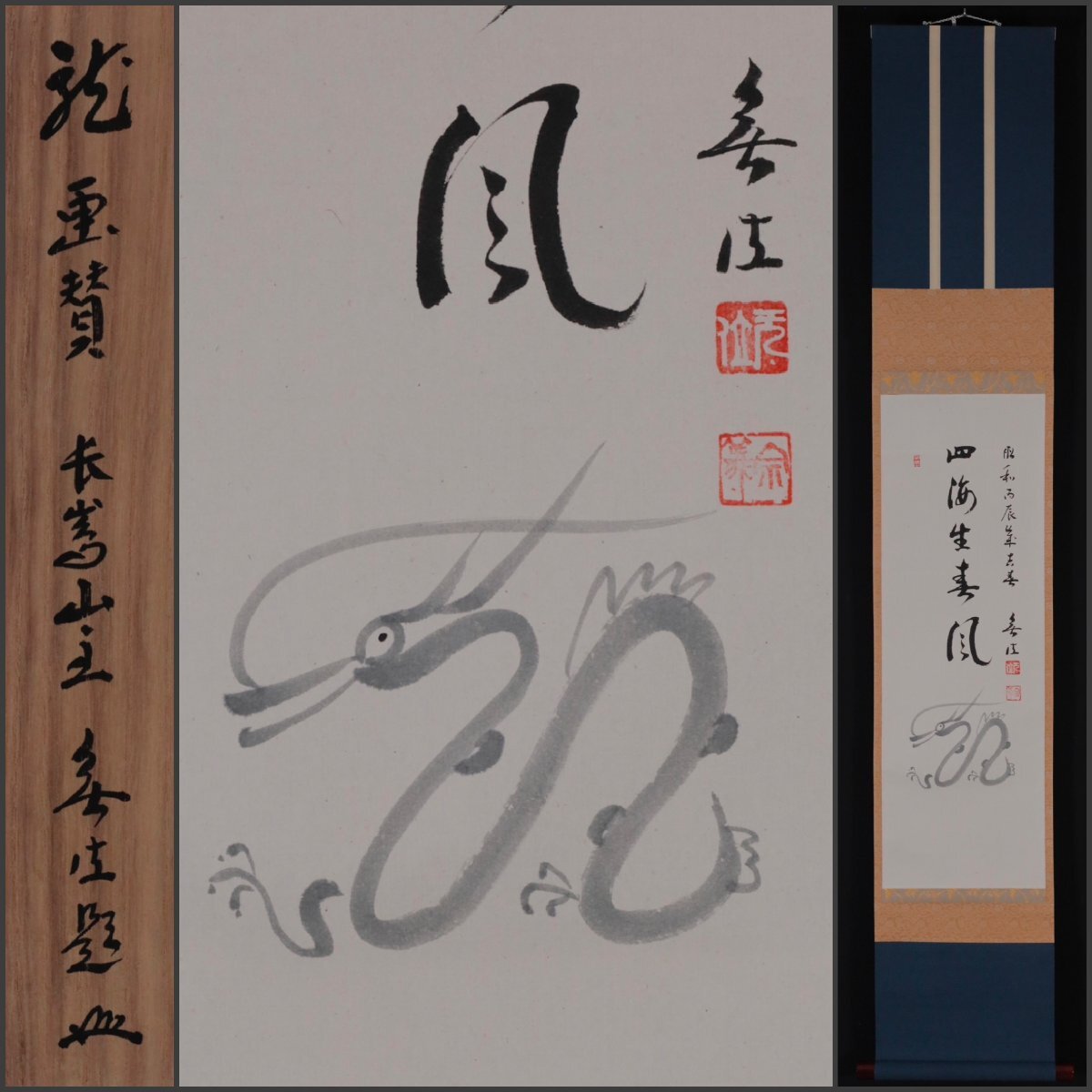 - 【模写】吉】12705 狭間宗義 龍画賛「四海生春風」 共箱 臨済宗 妙心寺667世住職 無位窟 仏教 茶掛け 茶道具 禅語 書 掛軸 掛け軸 骨董品