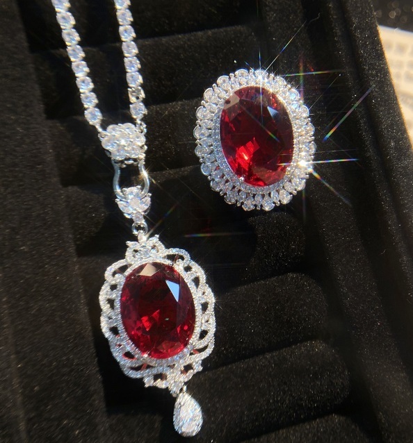 > ジュエリー2点 ペンダント ネックレス 高級感 リング 大粒ルビー 満々ジルコン ピカピカ 輝く アクセサリー チェーン付き