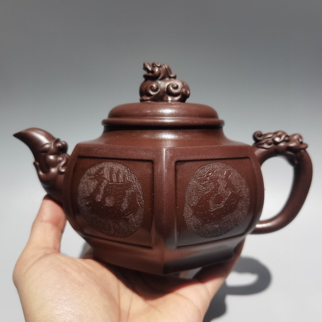 - 蔵友旧蔵出 紫砂壺 六方龍尊壺 徐漢棠款 原礦老紫泥 盒付 茶道品 煎茶道具 文房賞物 希少珍品 中国古玩 中国古美術品