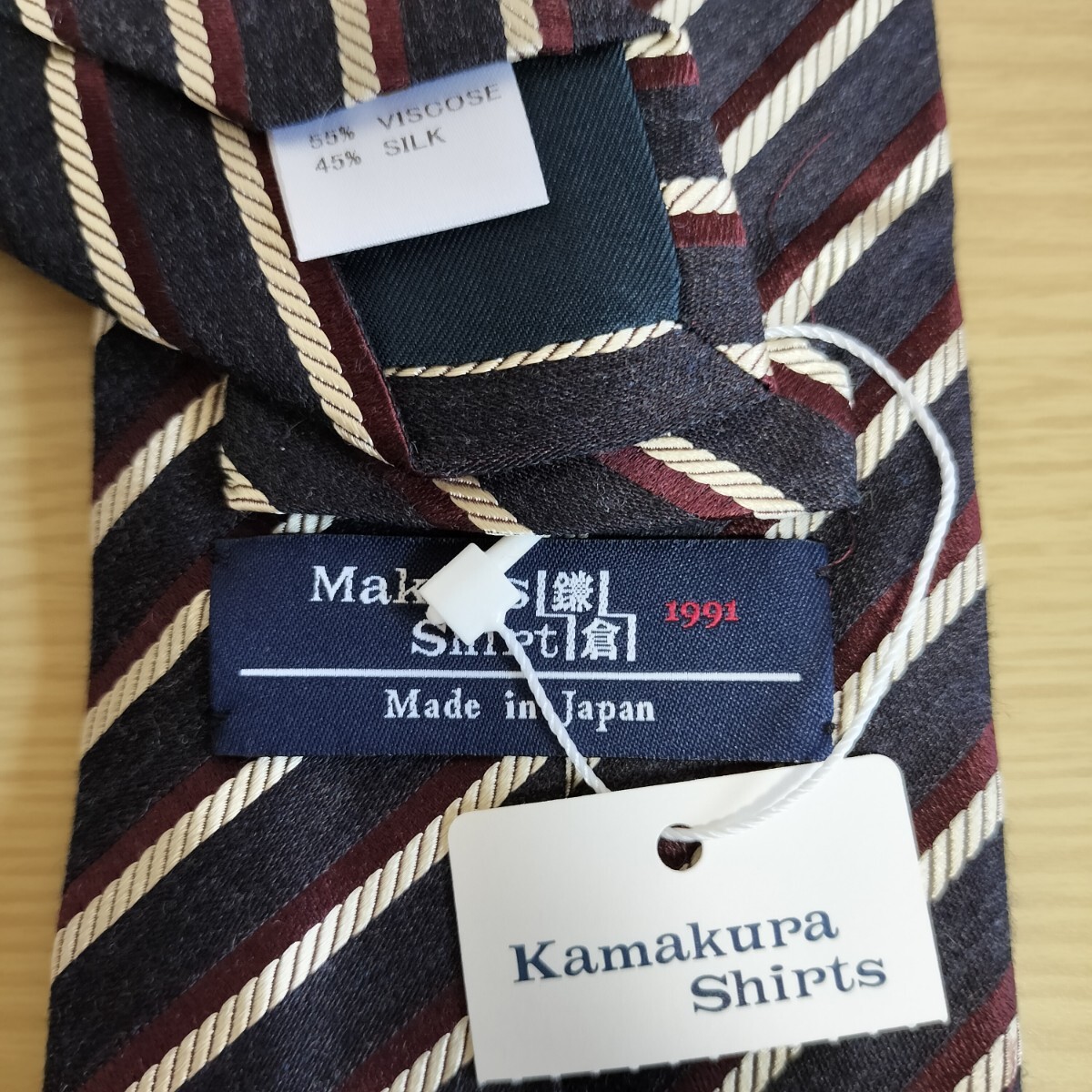 > Maker's Shirt鎌倉シャツメーカーズシャツカマクラ鎌倉 グレーボルドーシルバー線ストライプ模様ネクタイ新品 未使用 タグ付き